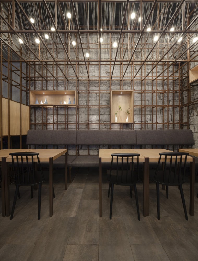 đèn bao bọc lấy hệ thống cấu trúc dạng lưới, từ đây không gian nội thất bắt đầu